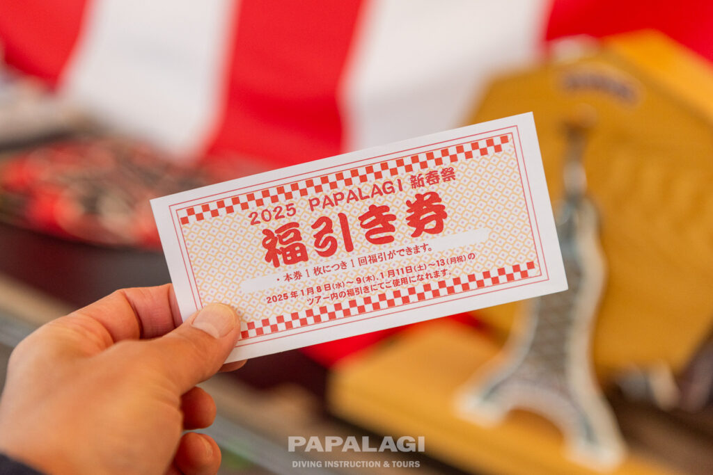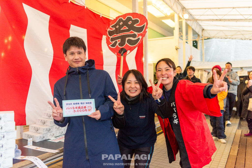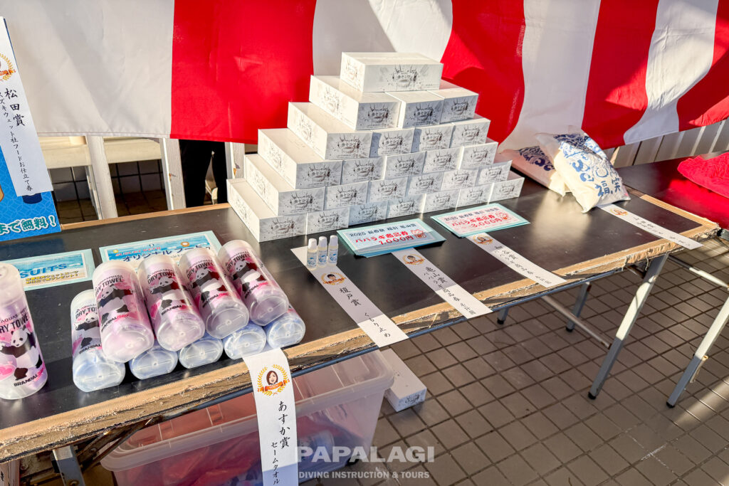 景品は、WETスーツにお米、曇り止めにパパラギティッシュなどなど、いろいろ当たります!