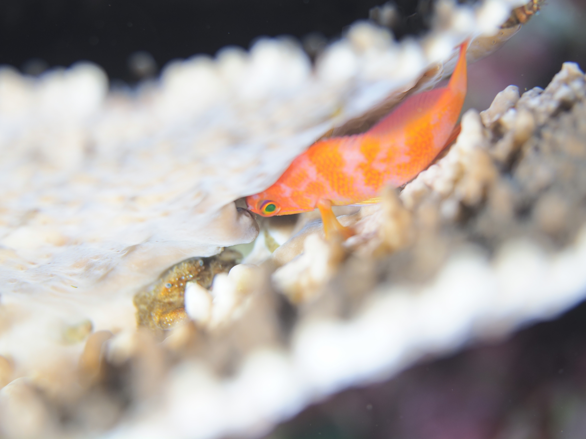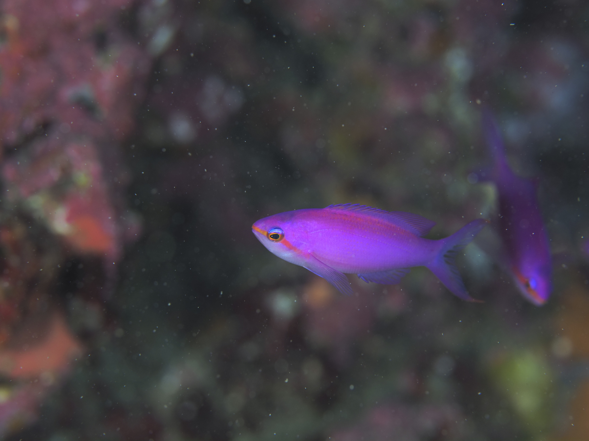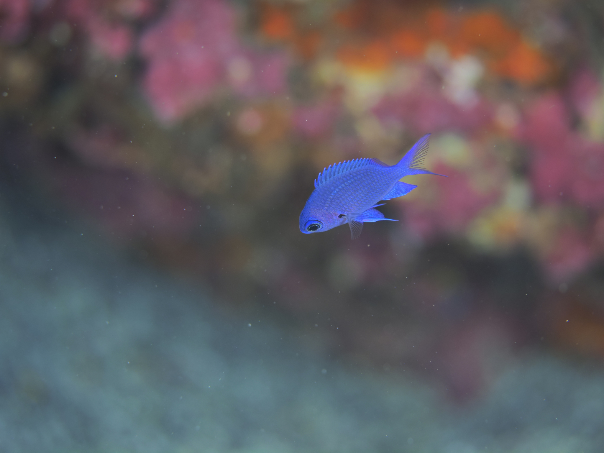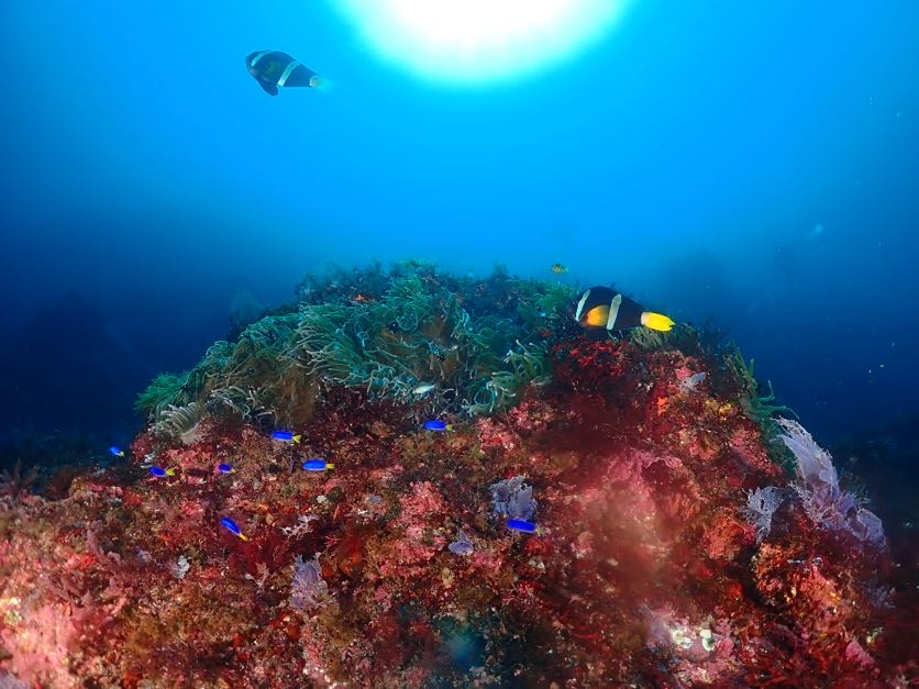 近くには、珍しくやや浅めの水深にいるシロボシスズメダイや