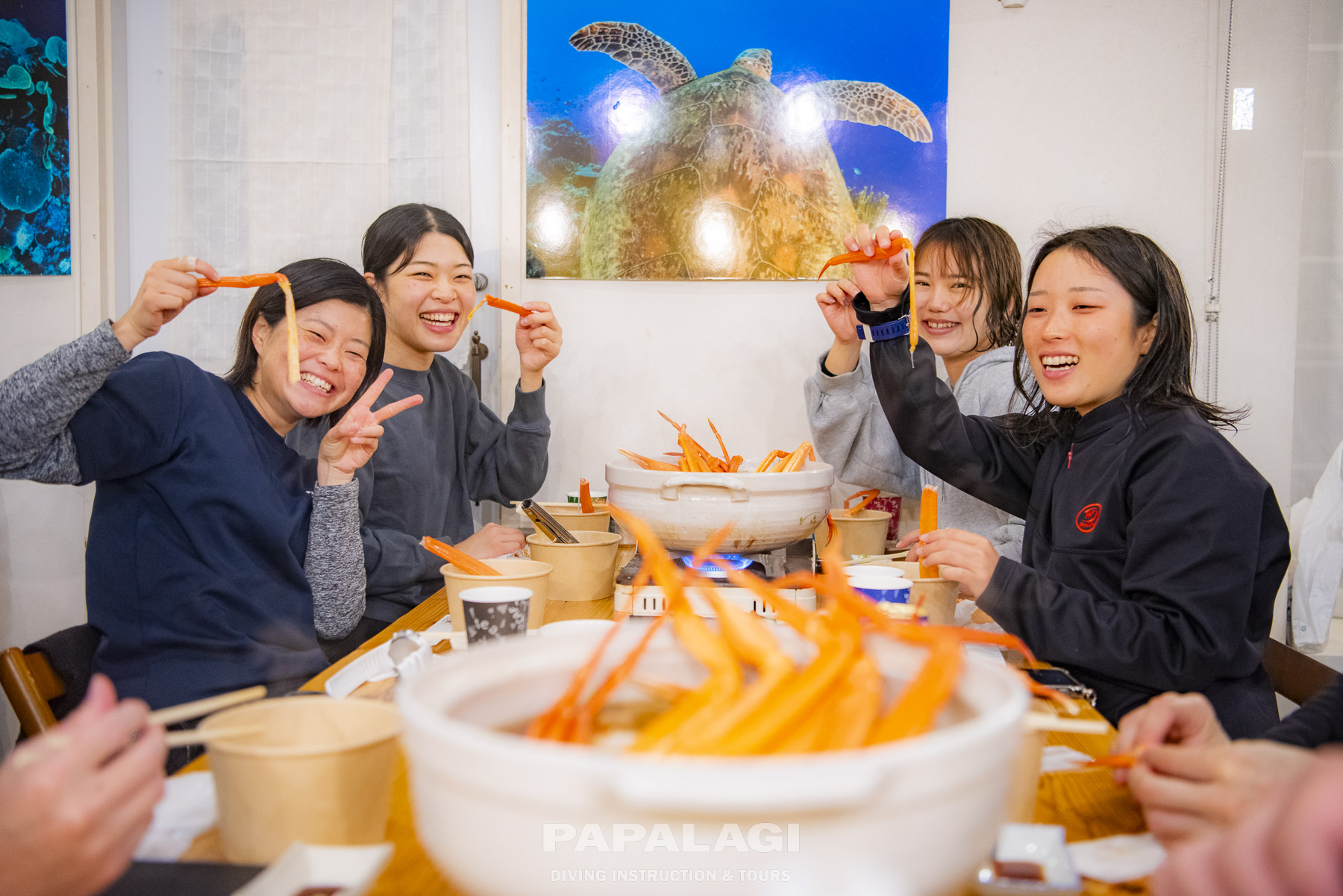 ナイトが終われば、冷えた体を温めてくれるお鍋が待っています。年越しなので豪華にカニ鍋です。自然と笑顔になってしまいますね。カニを食べるときはみんな集中していて静か笑