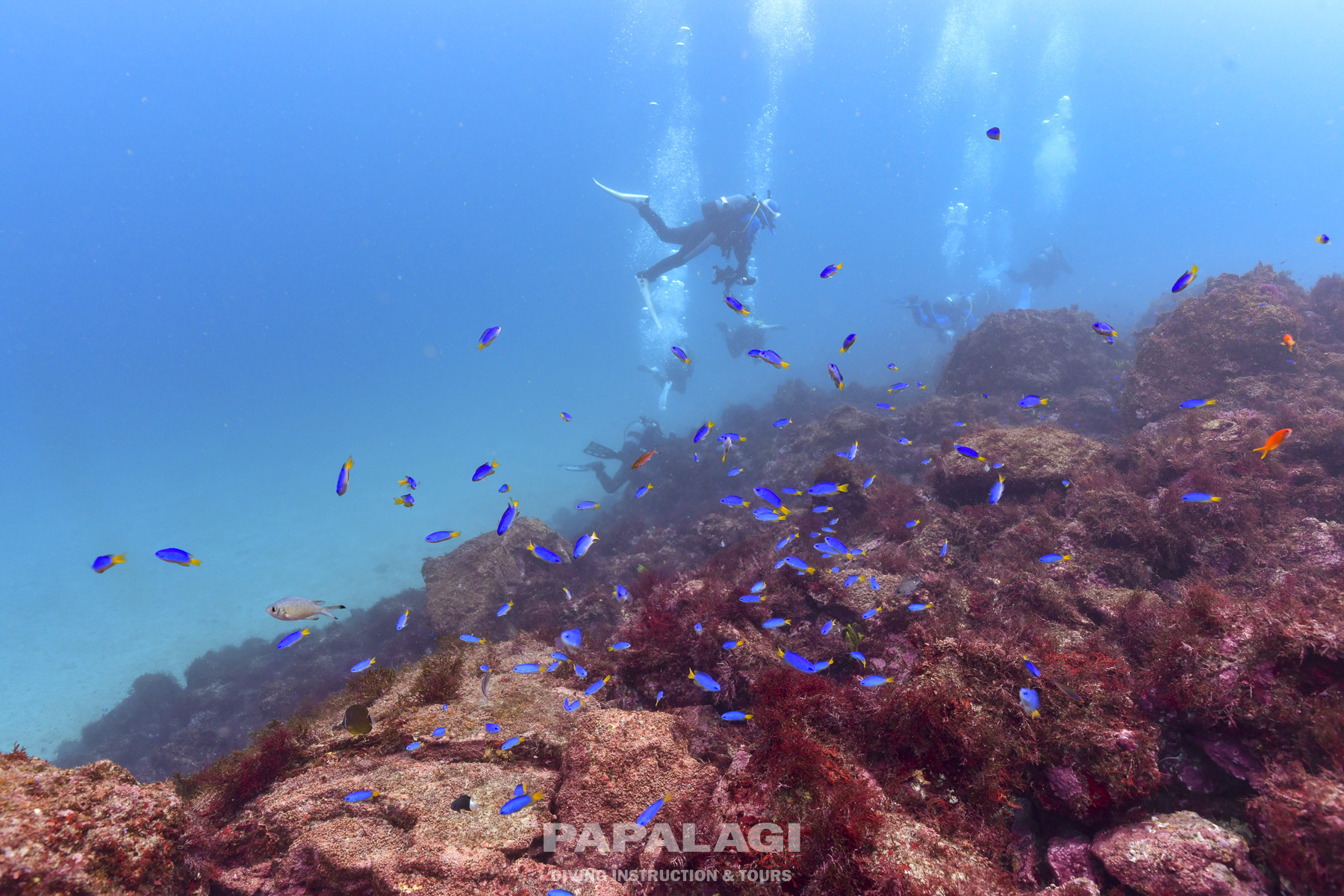 岩場ではまだまだ元気に泳ぐソラスズメダイがたくさん