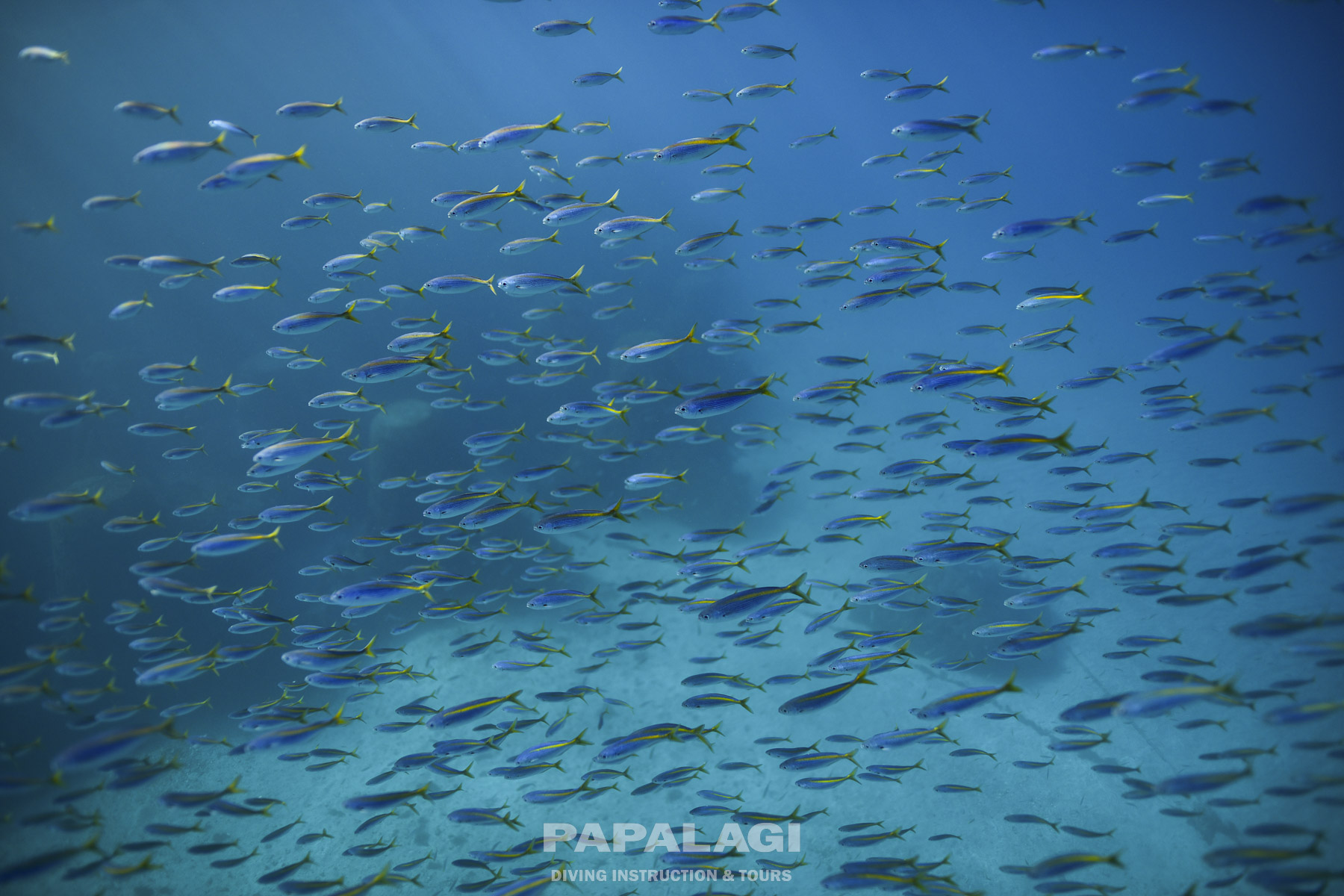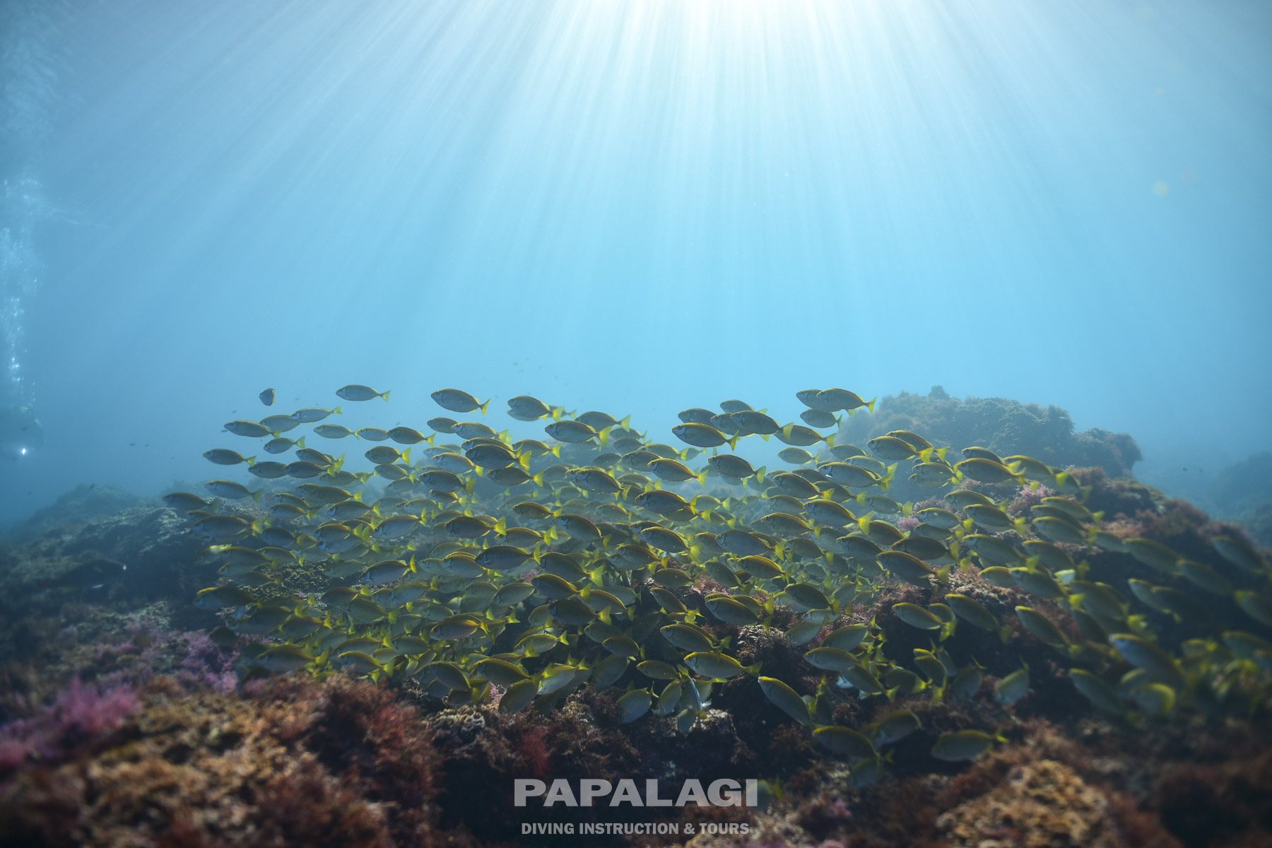 岩場ではまだまだ元気に泳ぐソラスズメダイがたくさん
