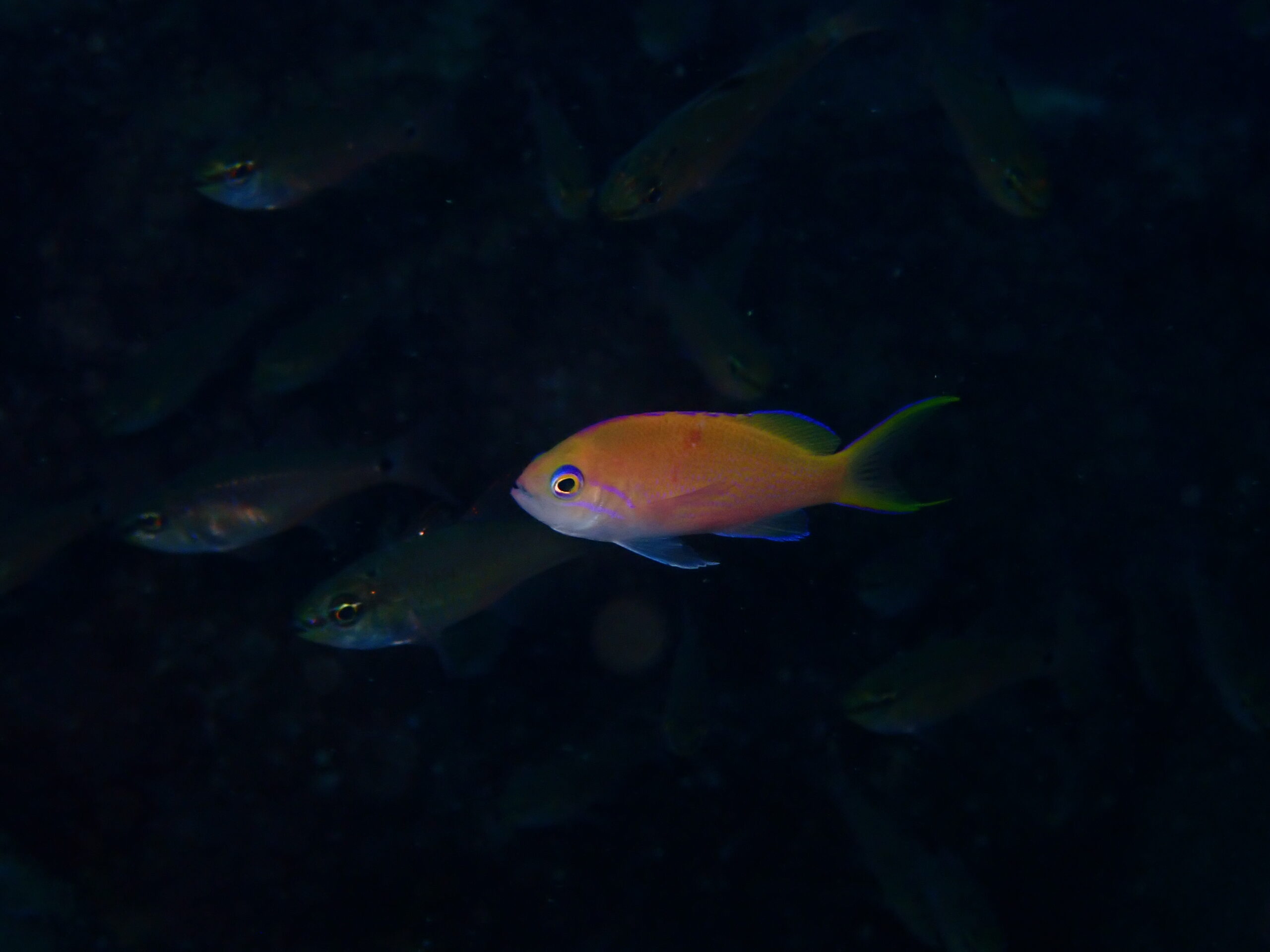 浅場のクロホシイシモチのなかに輝いているナガハナダイのメスや