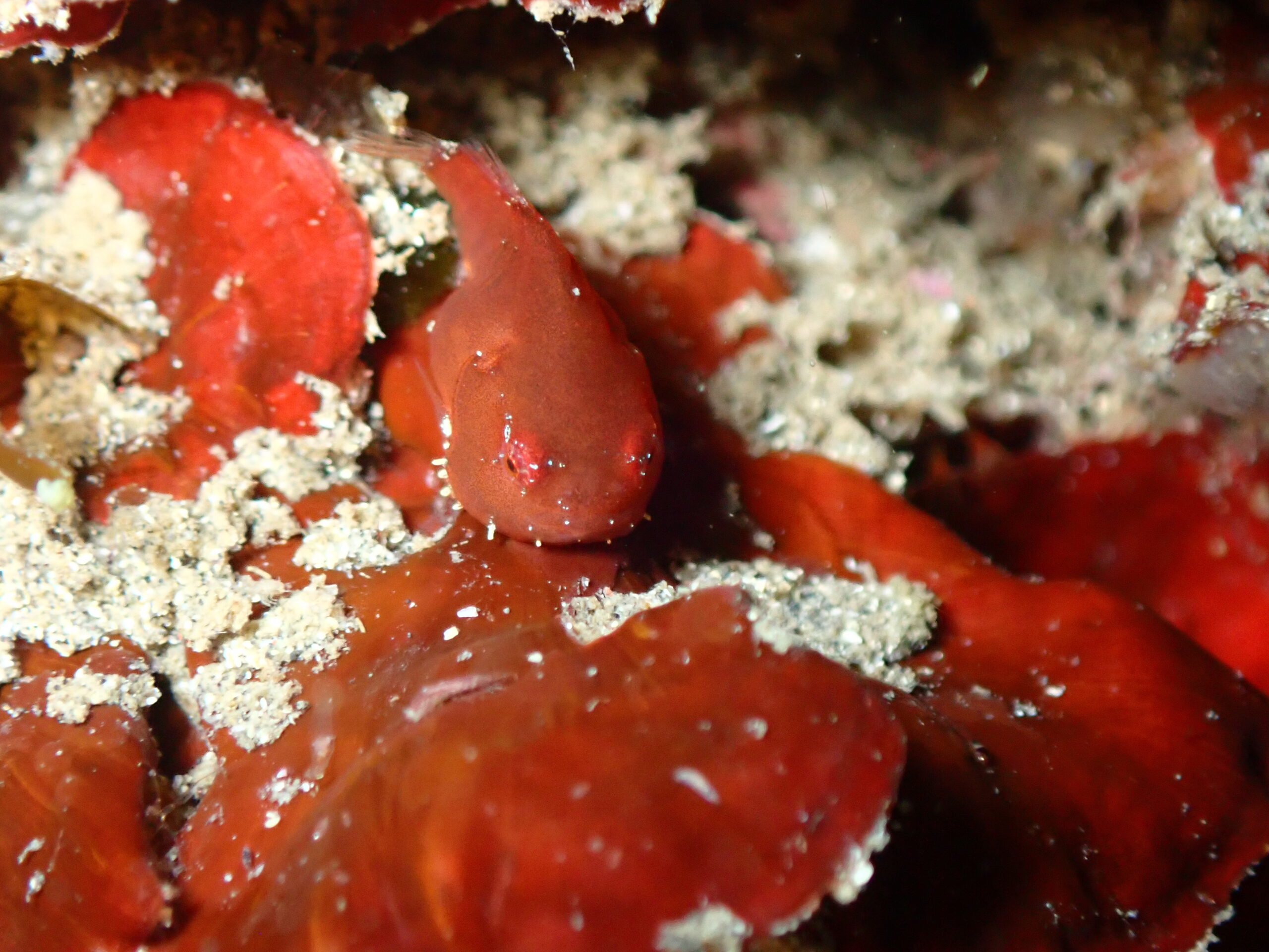 エツキイワノカワという赤い海藻にのっている赤いダンゴウオ